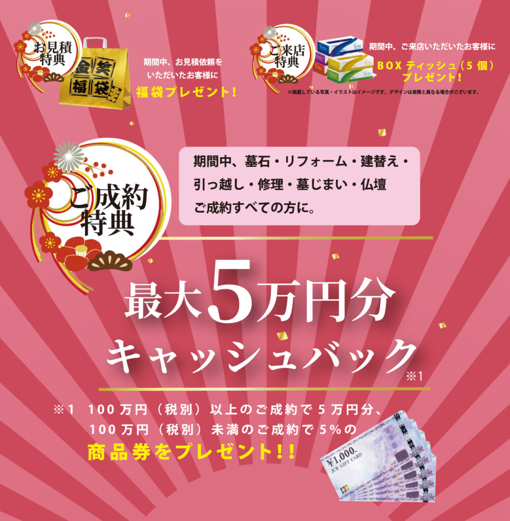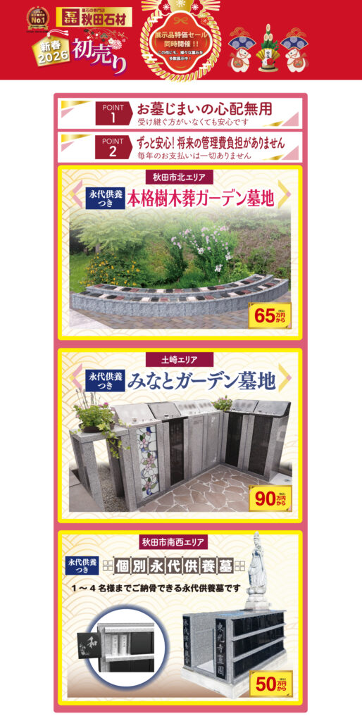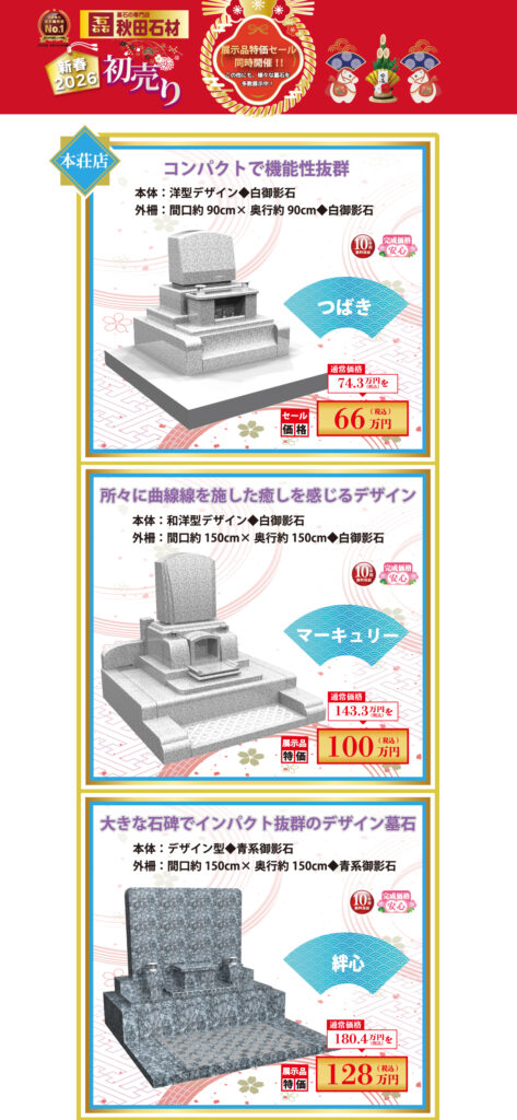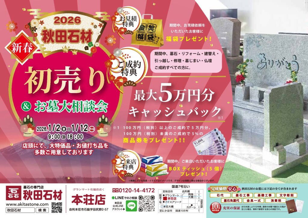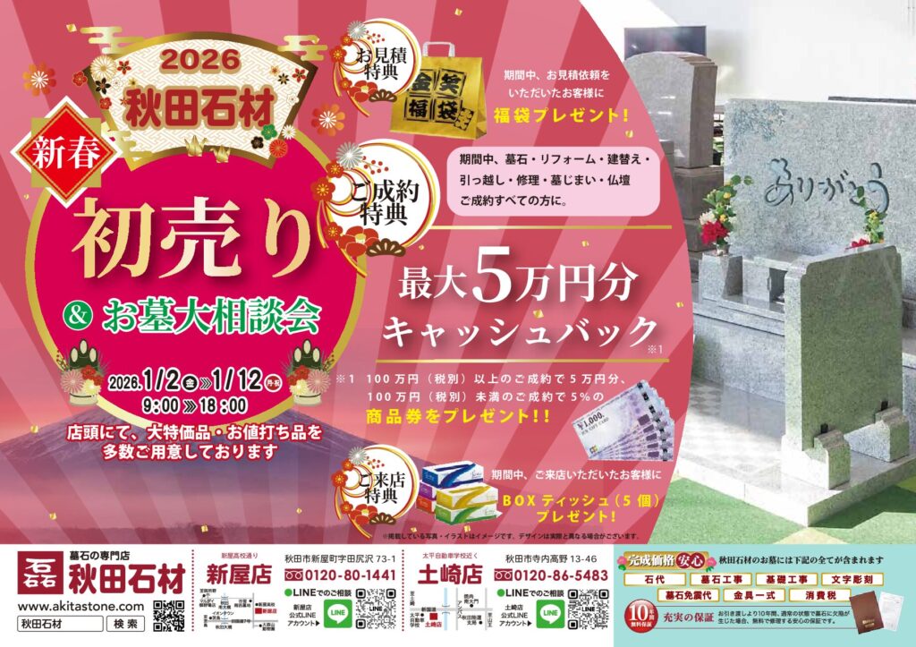 2026年1月2日(金)〜1月12日(月・祝)秋田石材県内3店舗(新屋店・土崎店・本荘店)では、