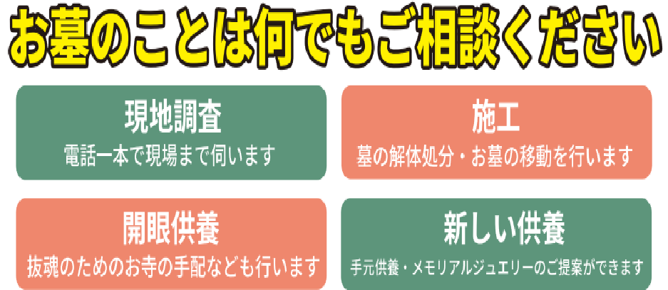 ・充実のサポート: 墓石の解体処分や撤去・更地化だけでなく、煩雑な行政手続きのお手伝いや、お骨の新しい供養相談までトータルでお手伝いします