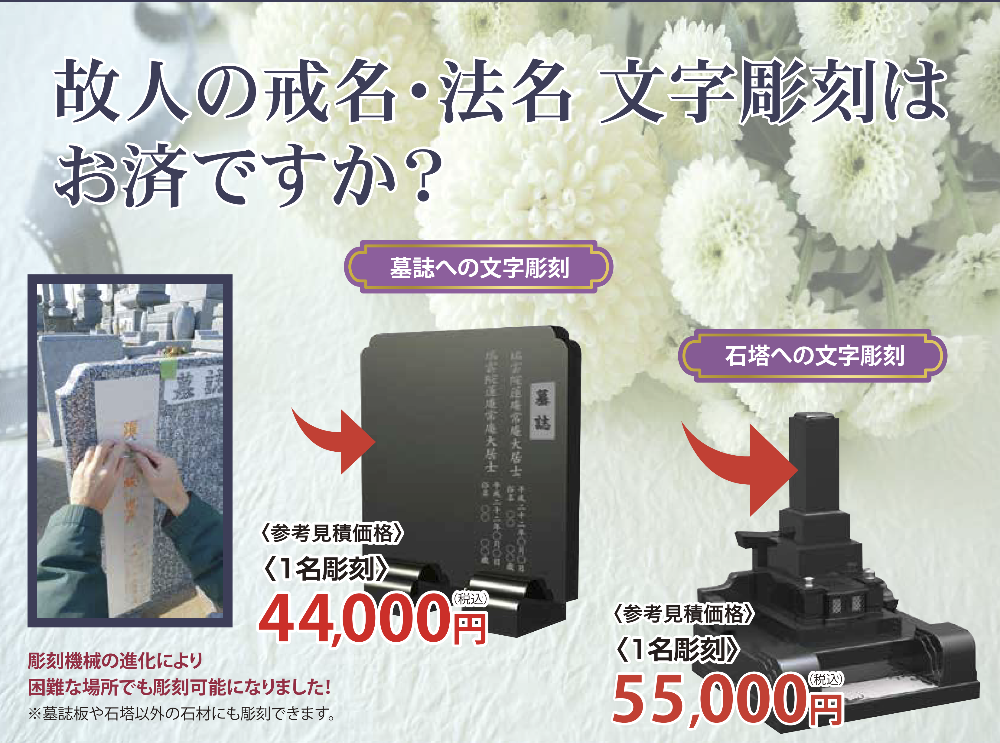 彫刻は故人様が安心して過ごされるための大切な仕上げです。ご家族皆様も心に区切りをつけ、故人様との思い出を大切にしながら前を向いて歩むための心のステップです。