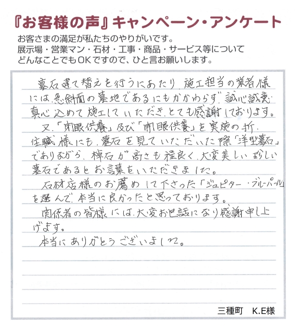 今回初めて親類のお墓の建立をお願いし、出来上がったのを見て大変満足して